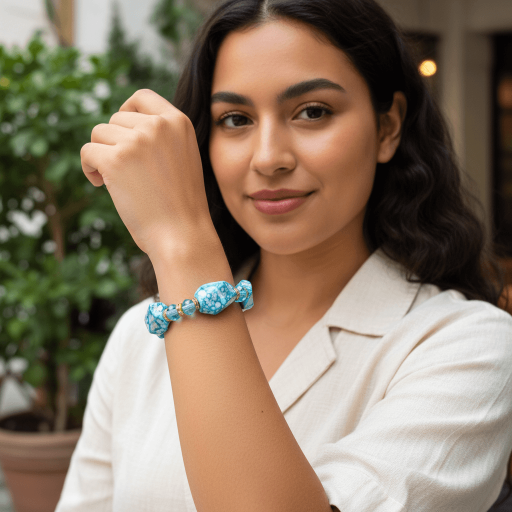 Elevate your style with the Gemstone Nuggets Stretch Beads Bracelet, featuring vibrant aqua-colored beads that complement any outfit. The stretch design ensures a comfortable fit for all-day wear, while the natural gemstone nuggets add a unique, eye-catching touch. Perfect for both casual and formal occasions, this bracelet brings a refreshing pop of color and effortless elegance to your accessory collection.