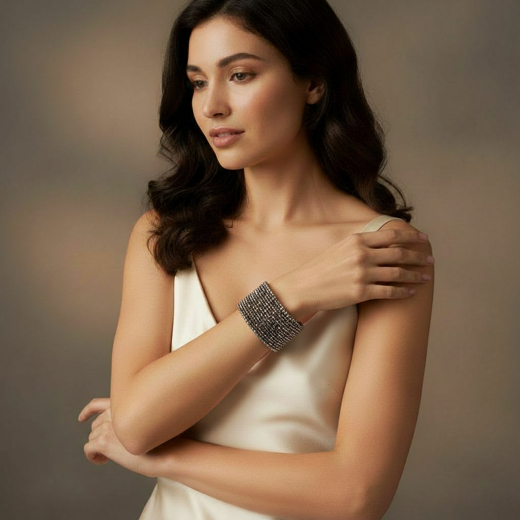Metallic Wrap Cuff Bracelet Silver Beaded Flexible